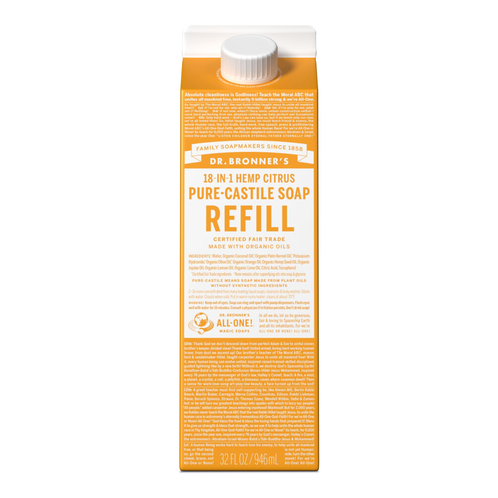 Dr. Bronner's - Pure-Castile Liquid Soap Refill 82% Less Plastic per Quart Made with Organic Oils 18-in-1 Uses For Face Body Hand Soap Refill H