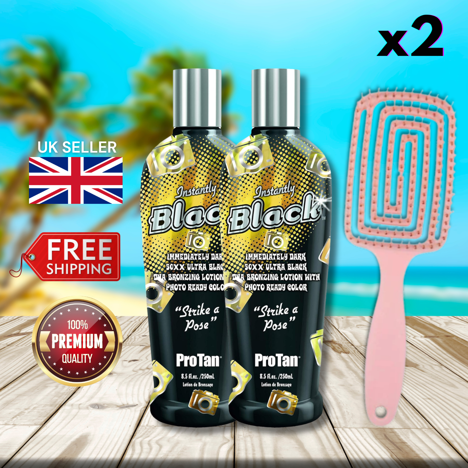 2 x Pro Tan Instantly Black 50XX Ultra Black Bronzing Lotion 250ml + Hair Brush