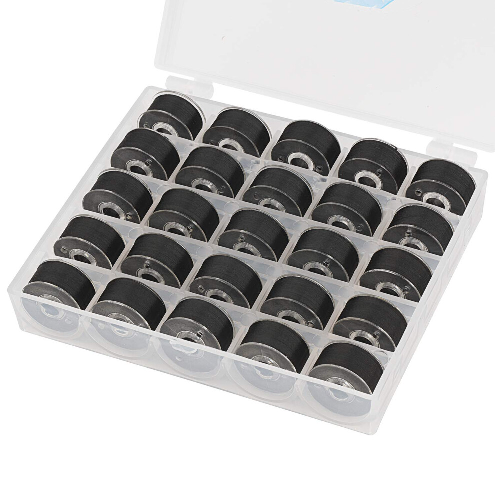 Simthread 25pcs Black Prewound Bobbin Thread Size A Class 15 SA156 60WT with Clear Storage Plastic Case Box 70D/2 for Brother Embroidery Thread Sewing