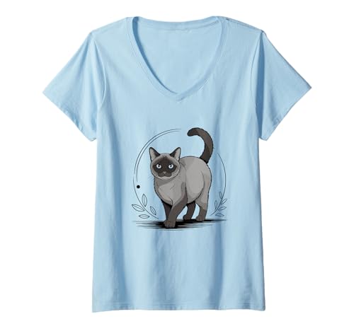 Womens Line Art Havana Brown Cat Minimalist V-Neck T-Shirt
