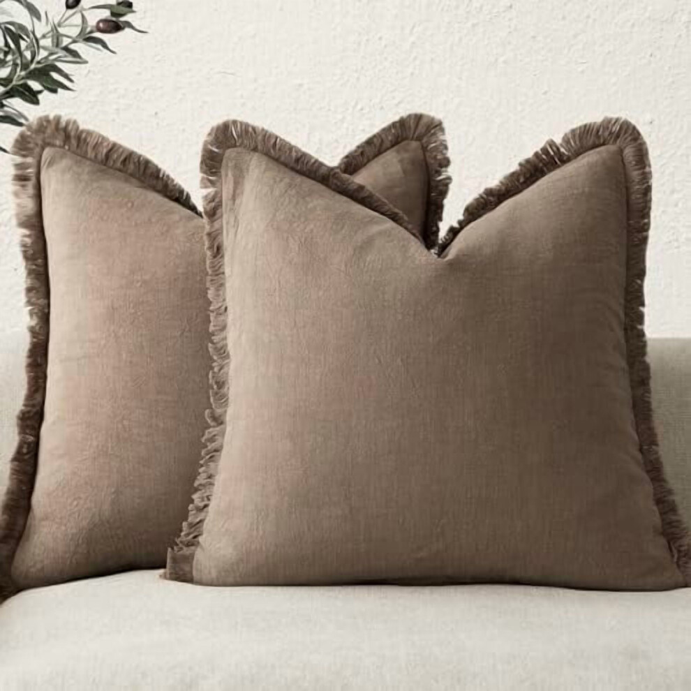 2-Pack Linen Fringe Pillow Covers, 1616", Light Brown Boho Farmhouse Cushion Covers with Tassels, Soft Accent Pillowcases for Couch/Sofa â