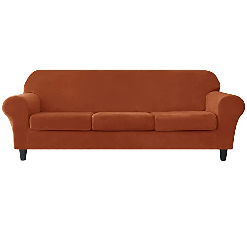 Stretch Sofa Slipcover, Soft Velvet Sofa Covers for 3 Cushion Couch Thick Furniture Protector for Pets & Kids (Red-Brown, L)