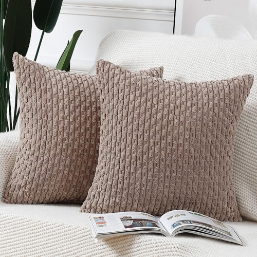 MIULEE Cushion Covers 40 x 40 cm Decorative Corduroy Brown Cushions Throw Pillow Square 16 x 16 Inches Striped Solid for Sofa Couch Home Bedroom Set of 2