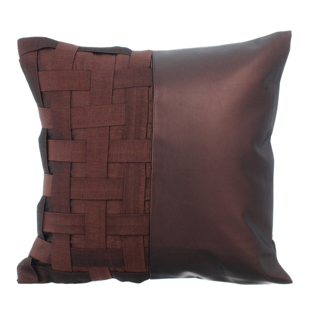 Brown Zippered Cushion Covers 16x16 inch, Silk Patchwork Matte Faux Leather, Modern Designer Throw Pillow Covers - Brown N Half