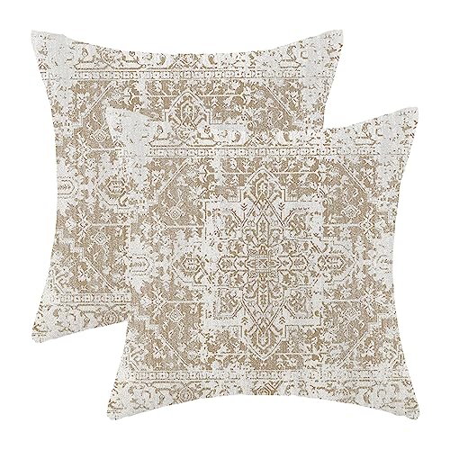 AEIOAE 2 Pack Ethnic Boho Throw Pillow Covers 20x20 Inch Brown Beige White Linen Square Cushion Covers Outdoor Indoor Decor for Sofa Bed