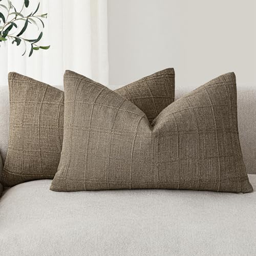 Foindtower Set of 2 Decorative Linen Check Throw Pillow Covers Neutral Farmhouse Lumbar Cushion Covers Modern Boho Home Decor for Sofa Chair Couch Bedroom Living Room Outdoor,12×20 Inch,Light Brown