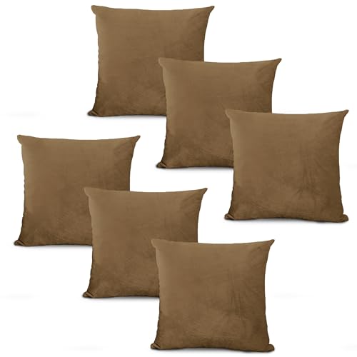 Hafaa Velvet Cushions with Covers Included Sets 12 (6 Brown Cushion Covers, 6 Cushion Inserts 45cm x 45cm) Luxury Decorative Fluffy Square Throw Pillow Case Sofa Cushion with Invisible Zipper