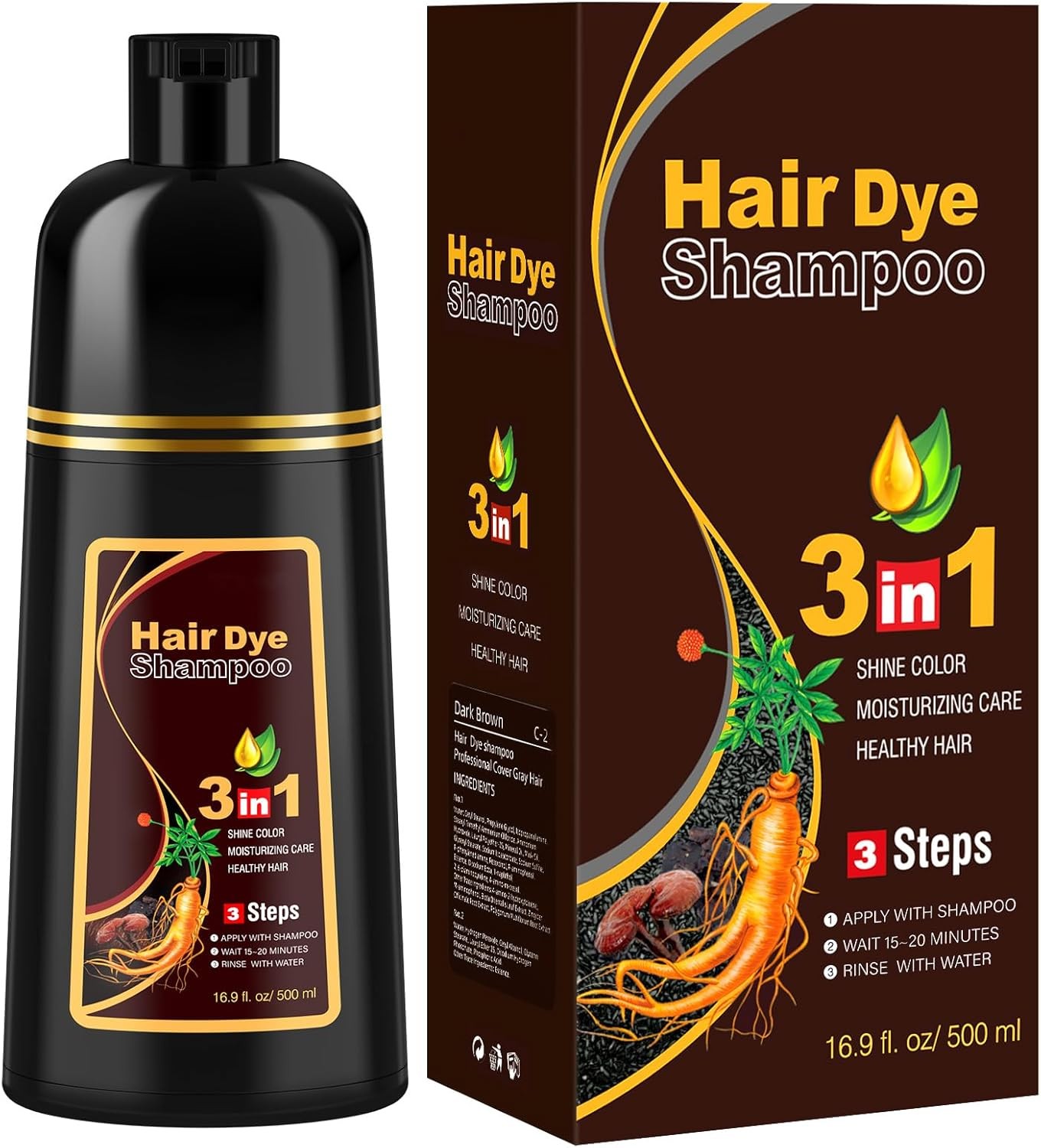 Dark Brown Hair Dye Shampoo, 500ML Hair Color Shampoo 3 in 1 for Grey Hair Beard