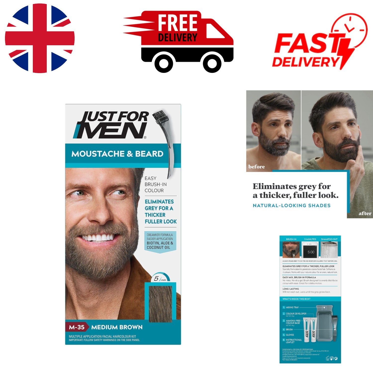 Just for men Moustache & Beard Medium Brown Dye Eliminates Grey Thicker Fuller