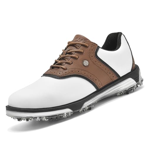 PENXZT Golf Shoes with Spiked for Mens Waterproof Leather Golf Sneakers Big Size,White Brown,11 UK