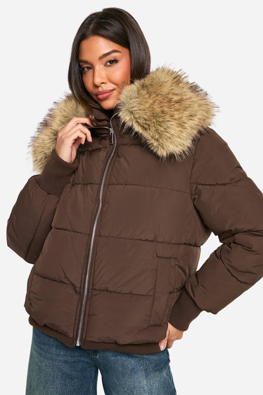Womens Faux Fur Collar Puffer Jacket - Brown - 12, Brown