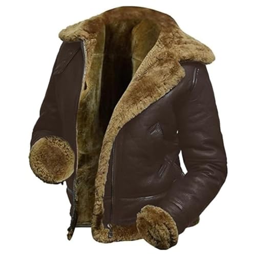 NLAVW Men Flying Winter Jacket,Shearling Leather Jacket Bomber Warm Filling Biker Motorcycle Fur Coat Jacket,brown,3XL