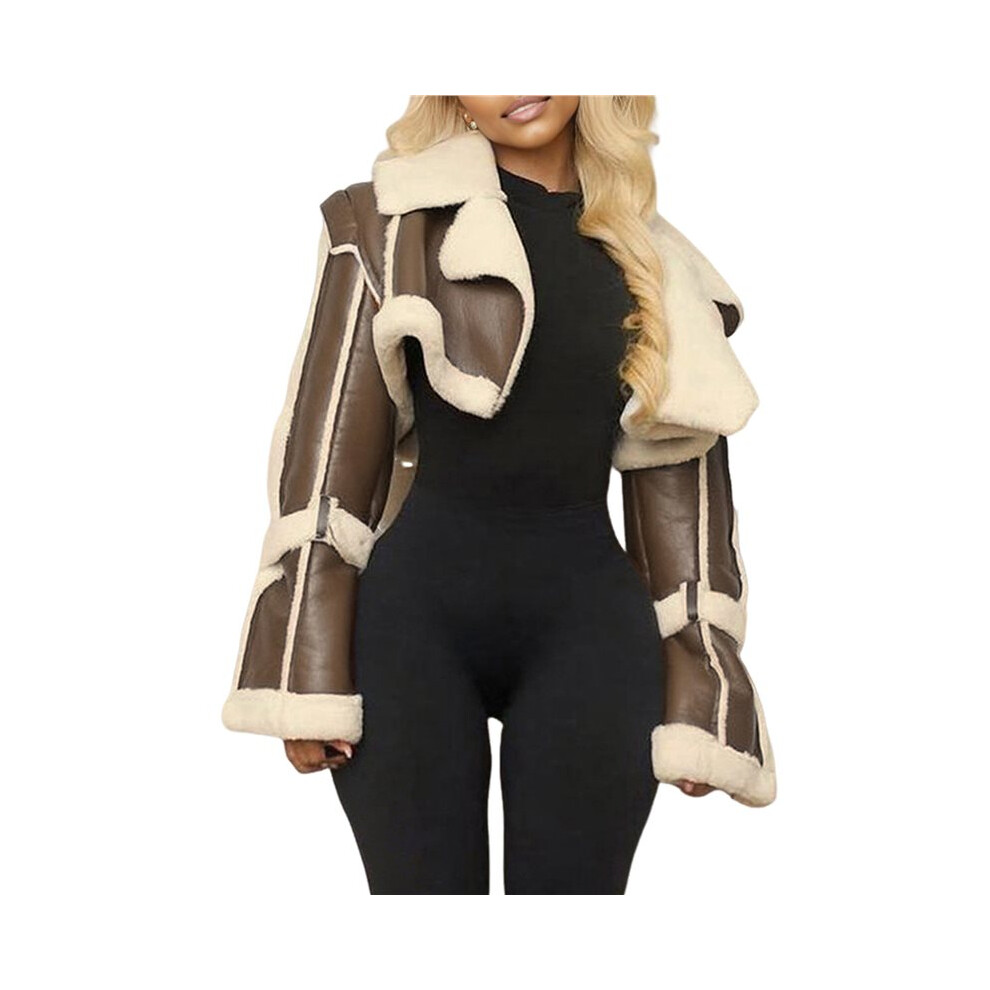 Women'S Cropped PU Leather Jacket with Fur Lining and Shearing Moto Texture Brown S