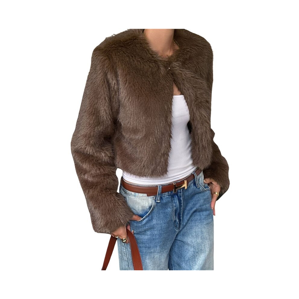 Women'S Fashion Cropped Faux Fur Jacket Long Sleeve Open Front Cardigan Casual Fluffy Parka Shaggy Short Coat Brown L