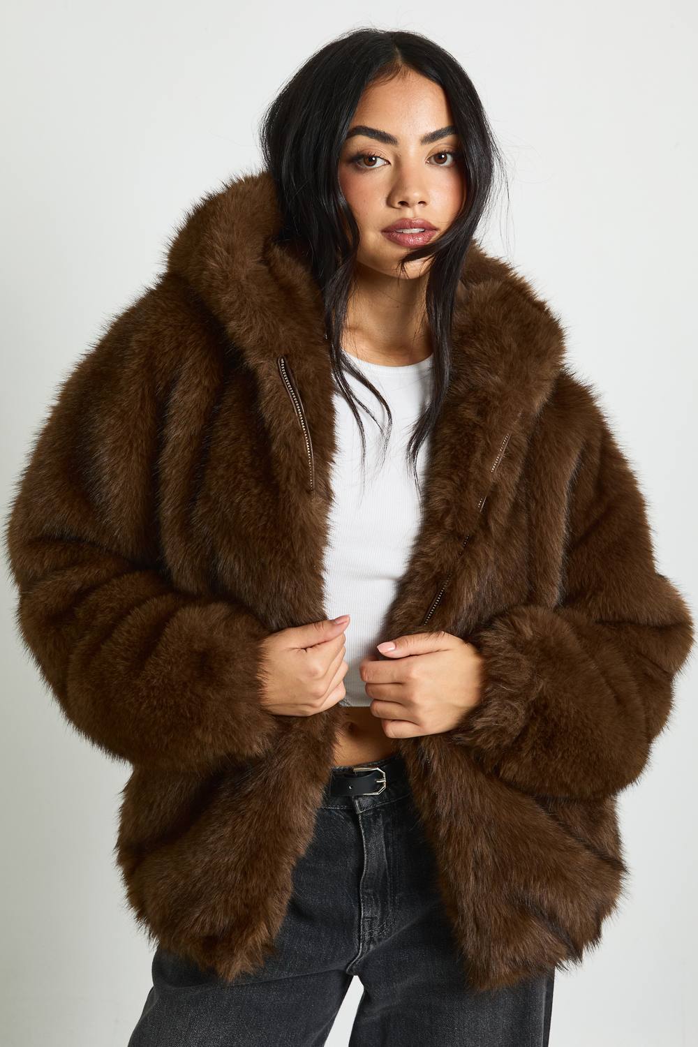 Womens Premium Faux Fur Hooded Jacket - Brown - 10, Brown