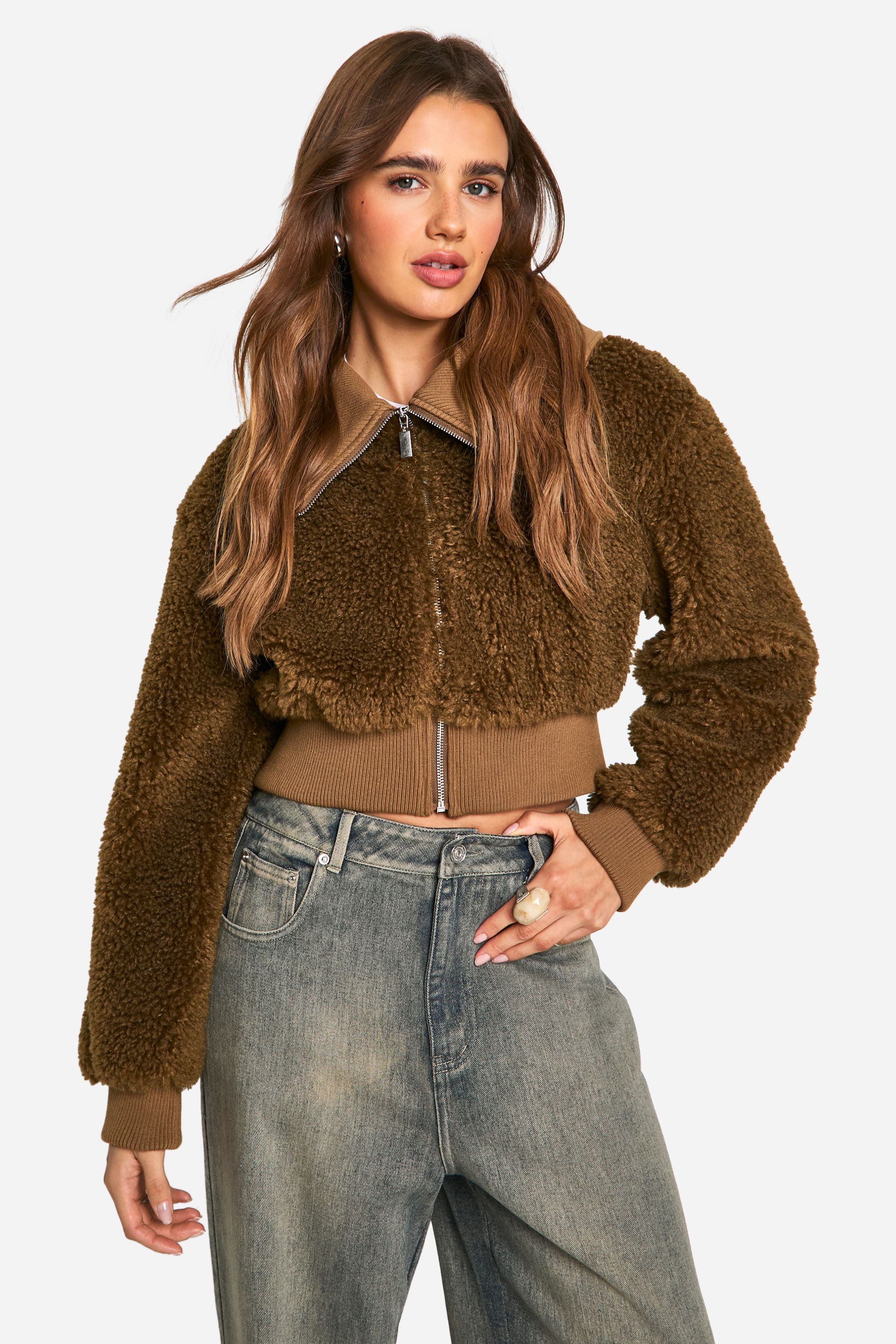 Womens Teddy Faux Fur Bomber Jacket - Brown - 8, Brown