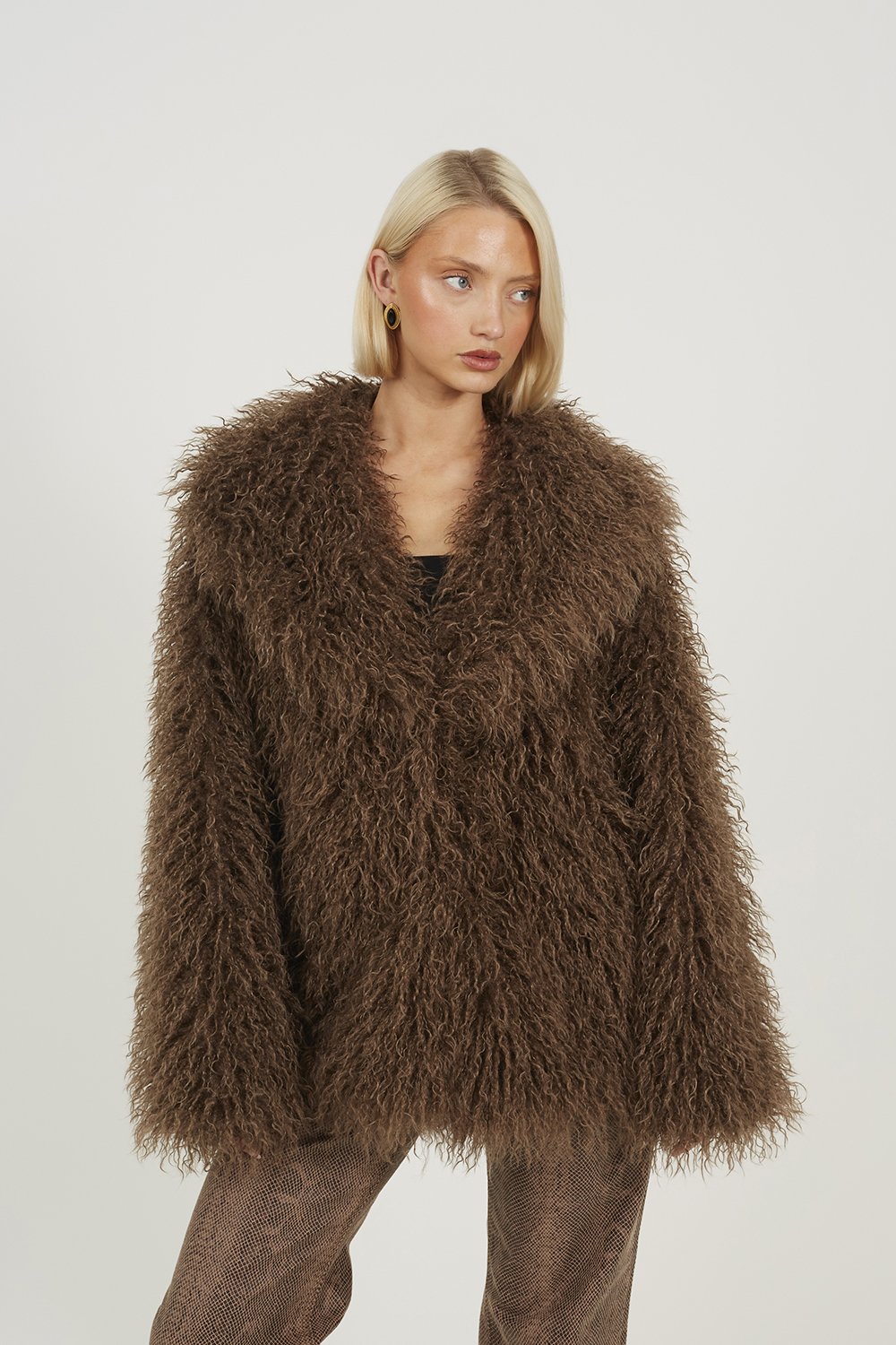 Brave Soul Womens Brown Shawl Collar Faux Mongolian Fur Jacket - Size 8 UK