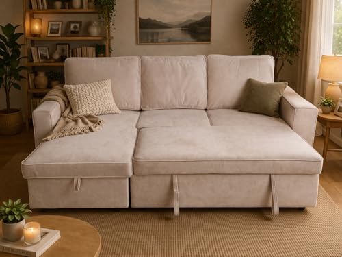 ZANGELI Light Brown L-Shaped Sofa Bed with Storage Chaise – Convertible 3-Seater Pull-Out Sleeper Couch, Modern Space-Saving Corner Sofa for Living Room