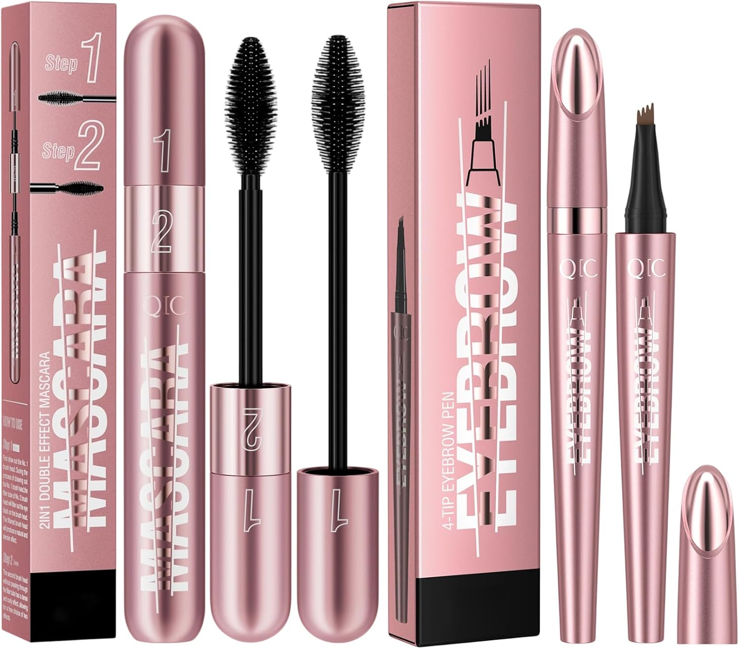 2 in 1 Black Mascara Waterproof and 4 Tip Dark Brown Eyebrow Pen, Volumising Len