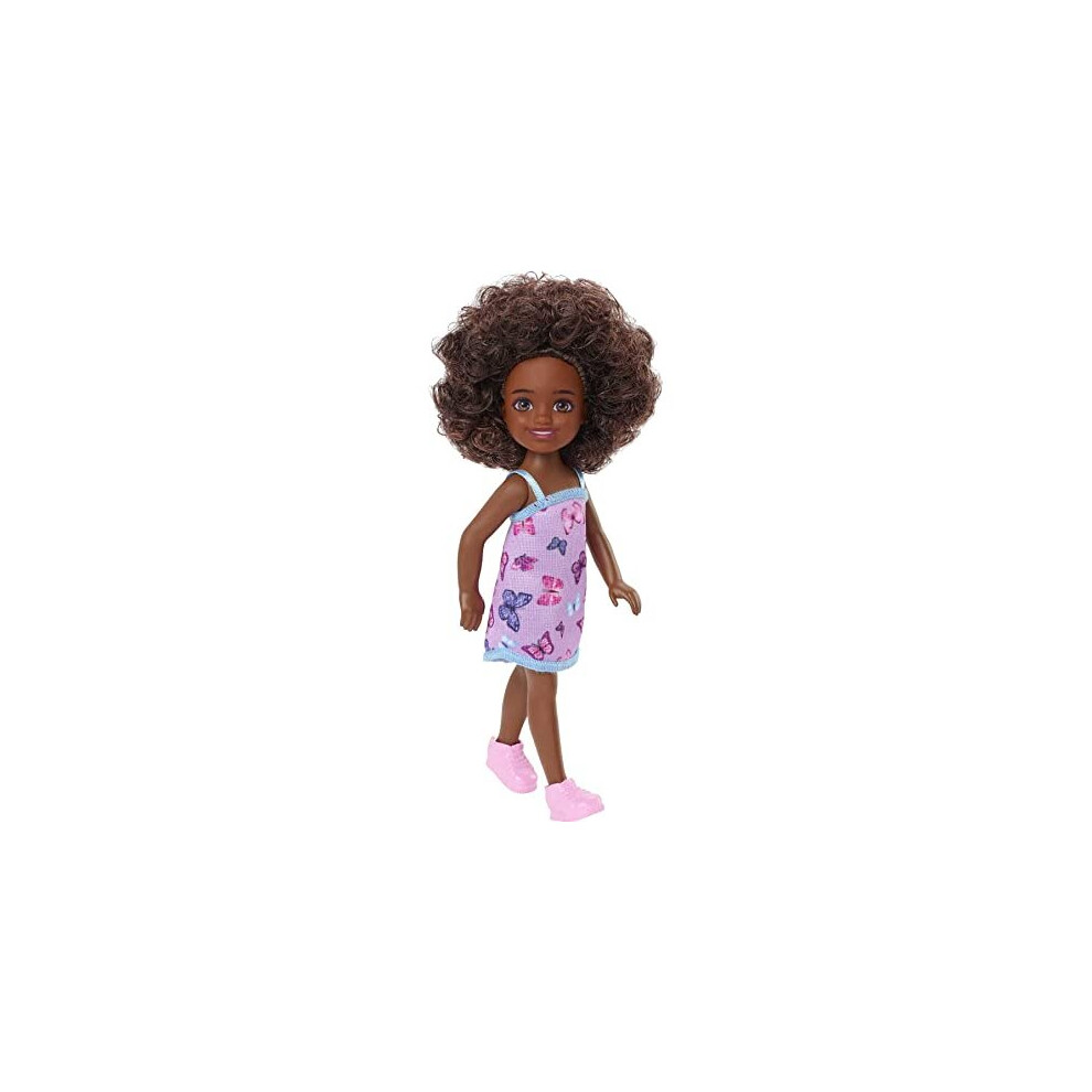 Barbie Chelsea Doll (Curly Brunette Hair) Wearing Butterfly-Print Dress and Pink Shoes, Toy for Kids Ages 3 Ye