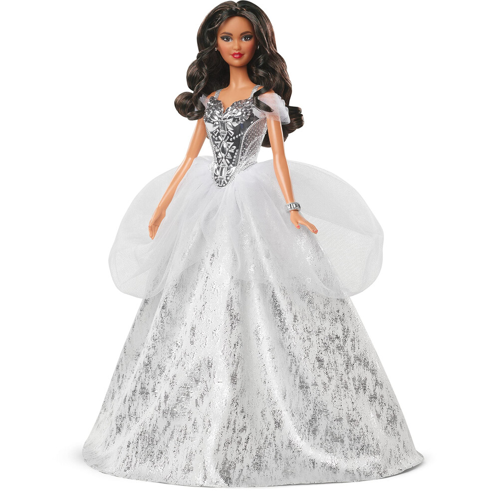 Barbie Signature 2021 Holiday Doll (12-inch Brunette Hair) in Silver Gown with Doll Stand and Certificate of Authenticity Gift for 6 Year Olds and