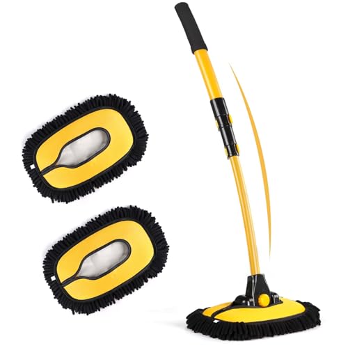 innhom 15° Curve Car Wash Brush,Telescopic Car Cleaning Brush, Microfibre Car Wash Brush Mop, Upgraded Aluminum Alloy Car Wash Brush Long Handle for Cars RV SUV Truck (Yellow( Mop and 2 Head))