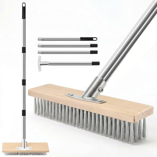 Heavy Duty Wire Broom with Telescopic Handle, Stiff Metal Bristle Brush for Removing Weed Moss Algae, Outdoor Floor Scrub Brush for Patio, Deck,