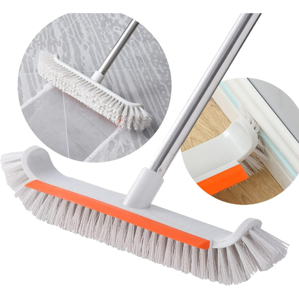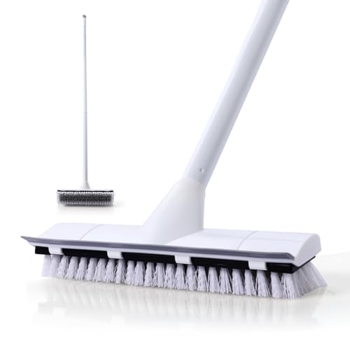 2 in 1 Floor Scrubbing Brush with Long Handle, Heavy Duty Stiff Bristle with Squeegee Shower Cleaning Scrub Brush for Cleaning Kitchen, Bathroom, Patio, Wall and Deck