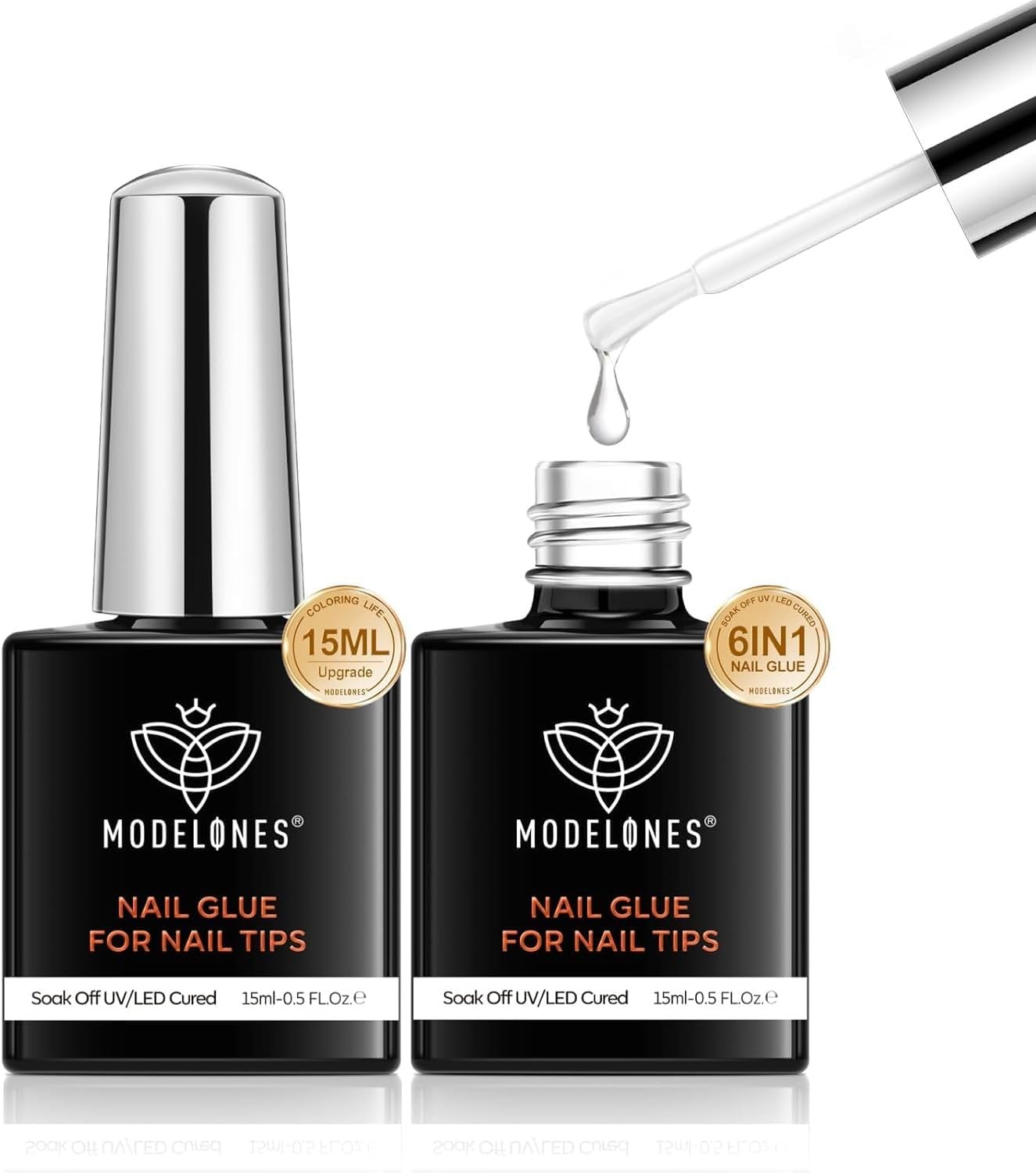 Modelones 2Pcs 6 in 1 Nail Glue Set - Base Coat, Brush On Gel, 15ml for Rhinestone, False Nails, Blooming Nail Art - U V Lamp Needed