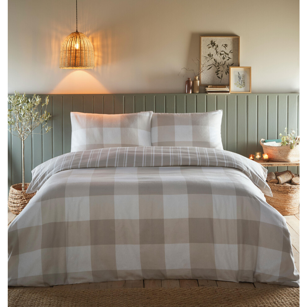 (Double, Beige) Brushed Cotton Duvet Set Warm Bedding Check Quilt Cover Sage or Natural