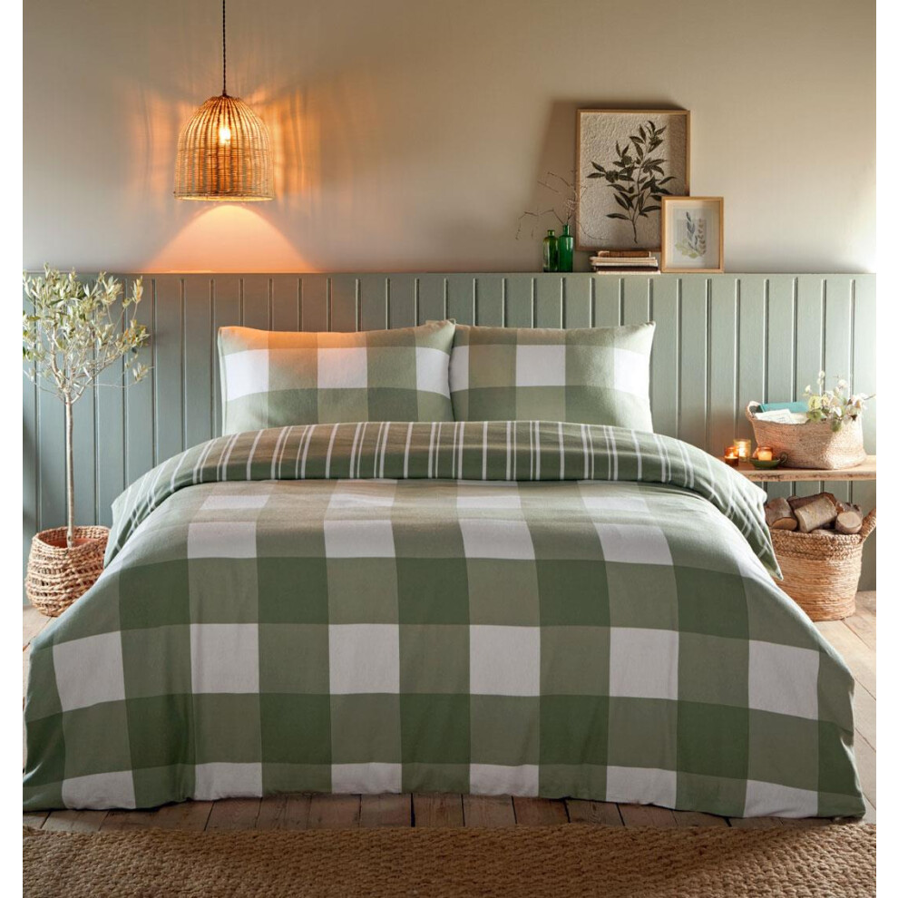 (Double, Green) Brushed Cotton Duvet Set Warm Bedding Check Quilt Cover Sage or Natural