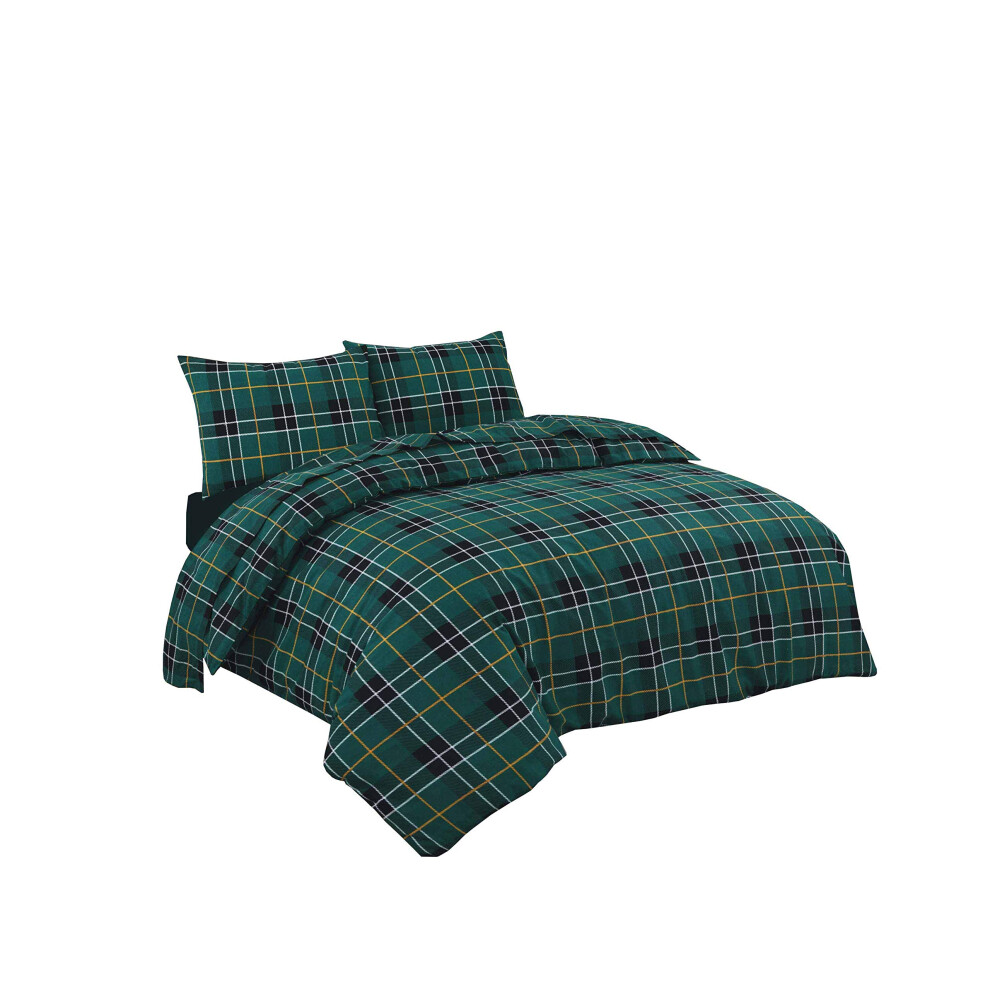 NZ Tartan Check Luxurious Flannel 100% Natural Brushed Cotton Thermal Duvet Cover Sets Reversible Bedding Sets (Green, Single)
