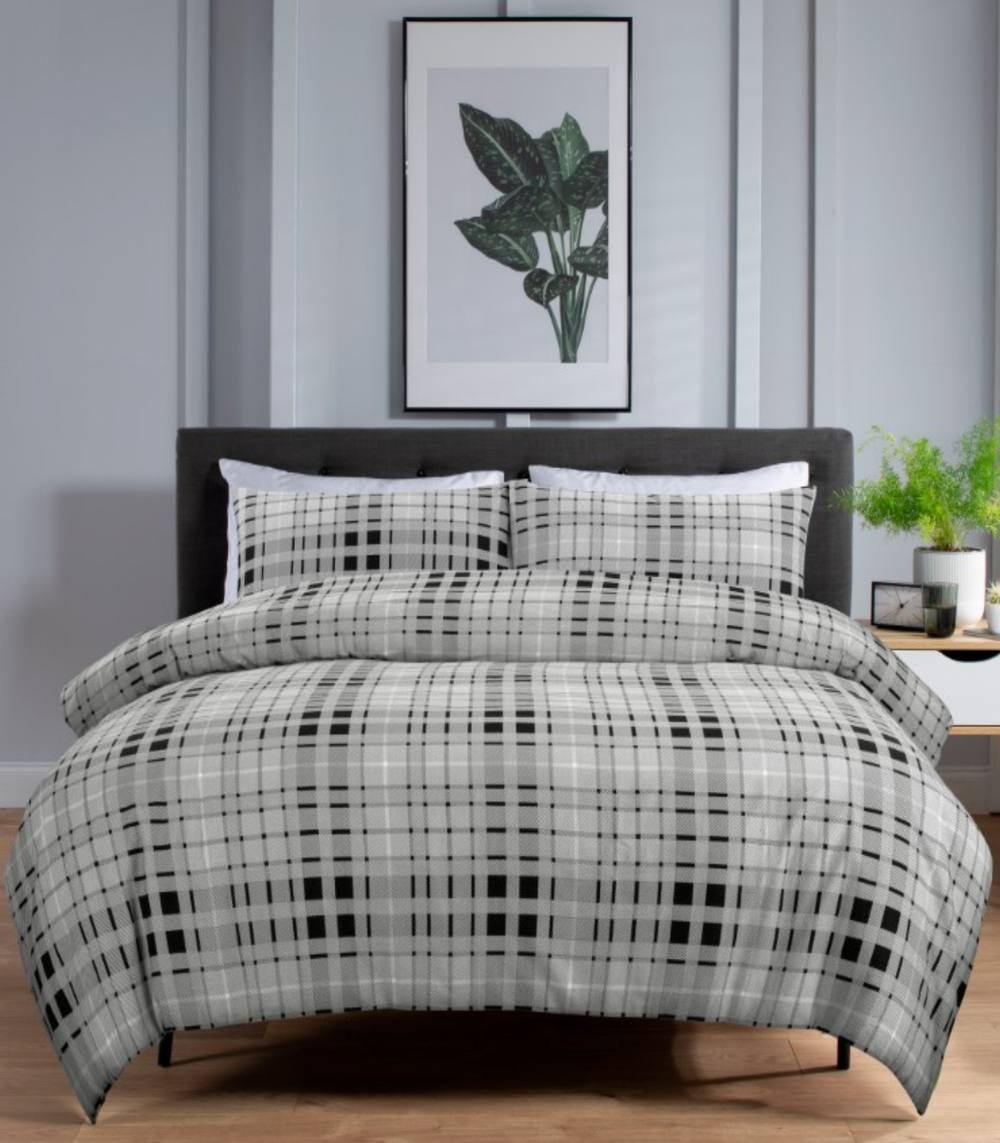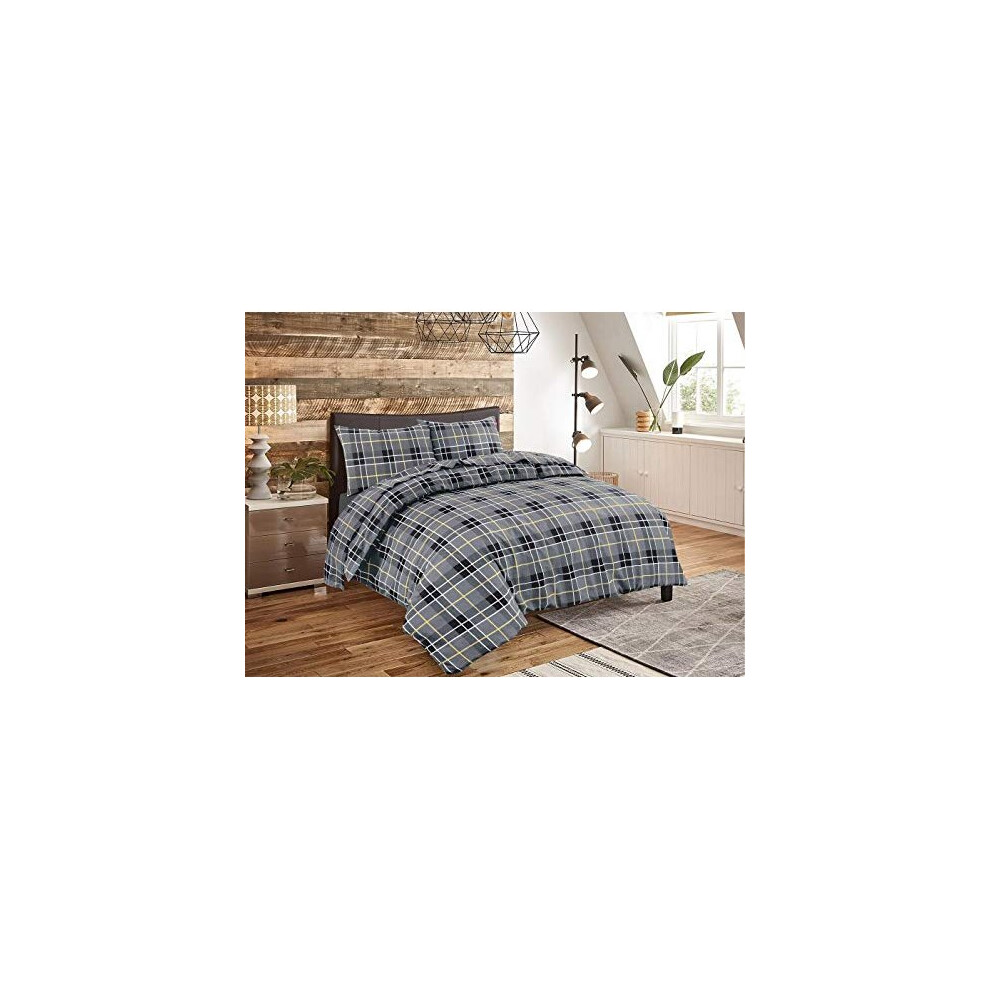 Flannelette Duvet Cover Set Check Printed Quilt Super King Size Reversible Bedding With Pillowcases 100% Brushed Cotton , Tartan Grey