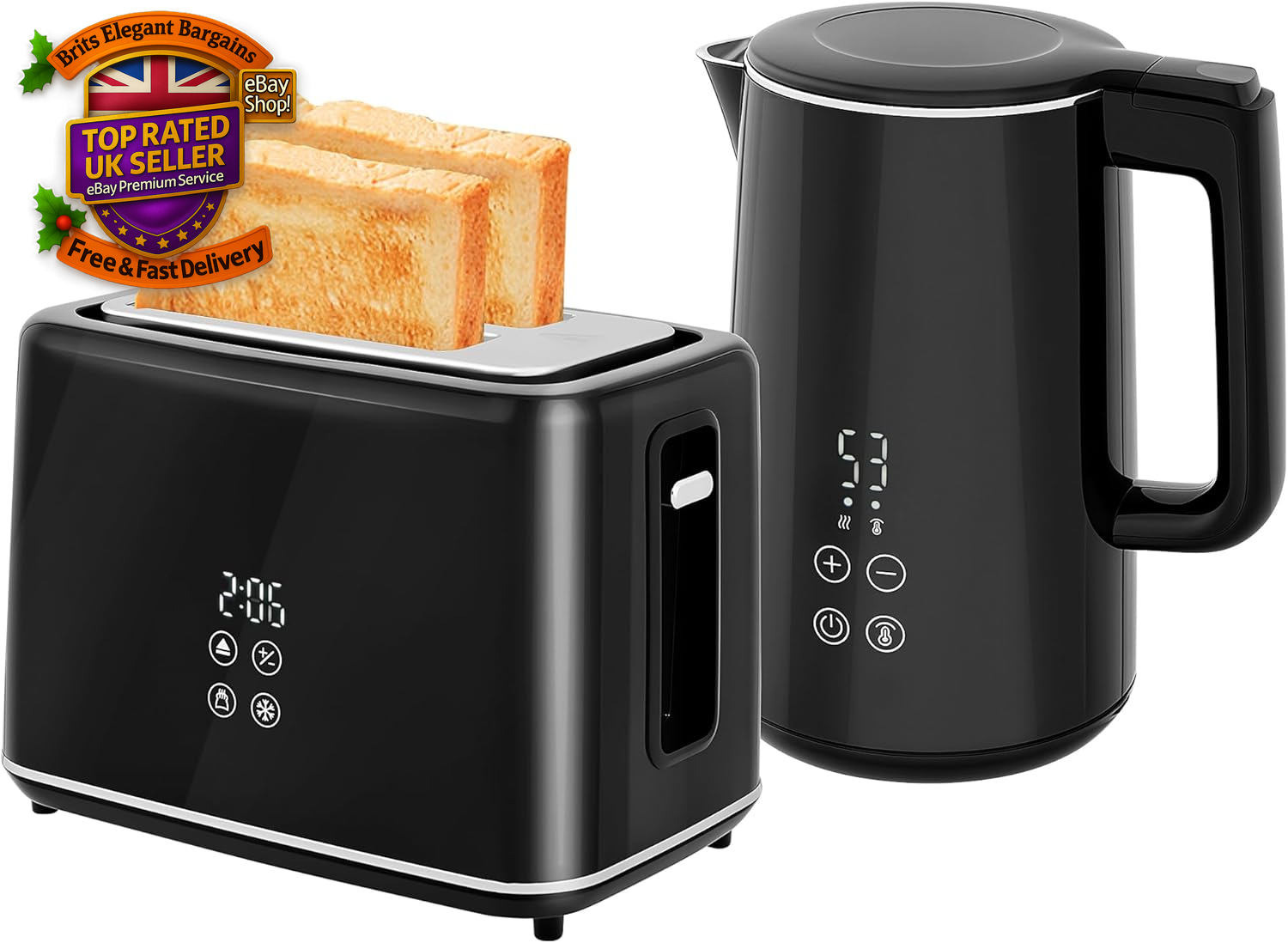 HOMCOM Digital Stainless Steel Kettle and Toaster Set, 1.5L 3000W Fast Boil Kettle, 2 Slice Toaster with 7 Level Browning Controls, Defrost, Reheat, Keep Warm, Crumb Tray and LED Touch Display, Black