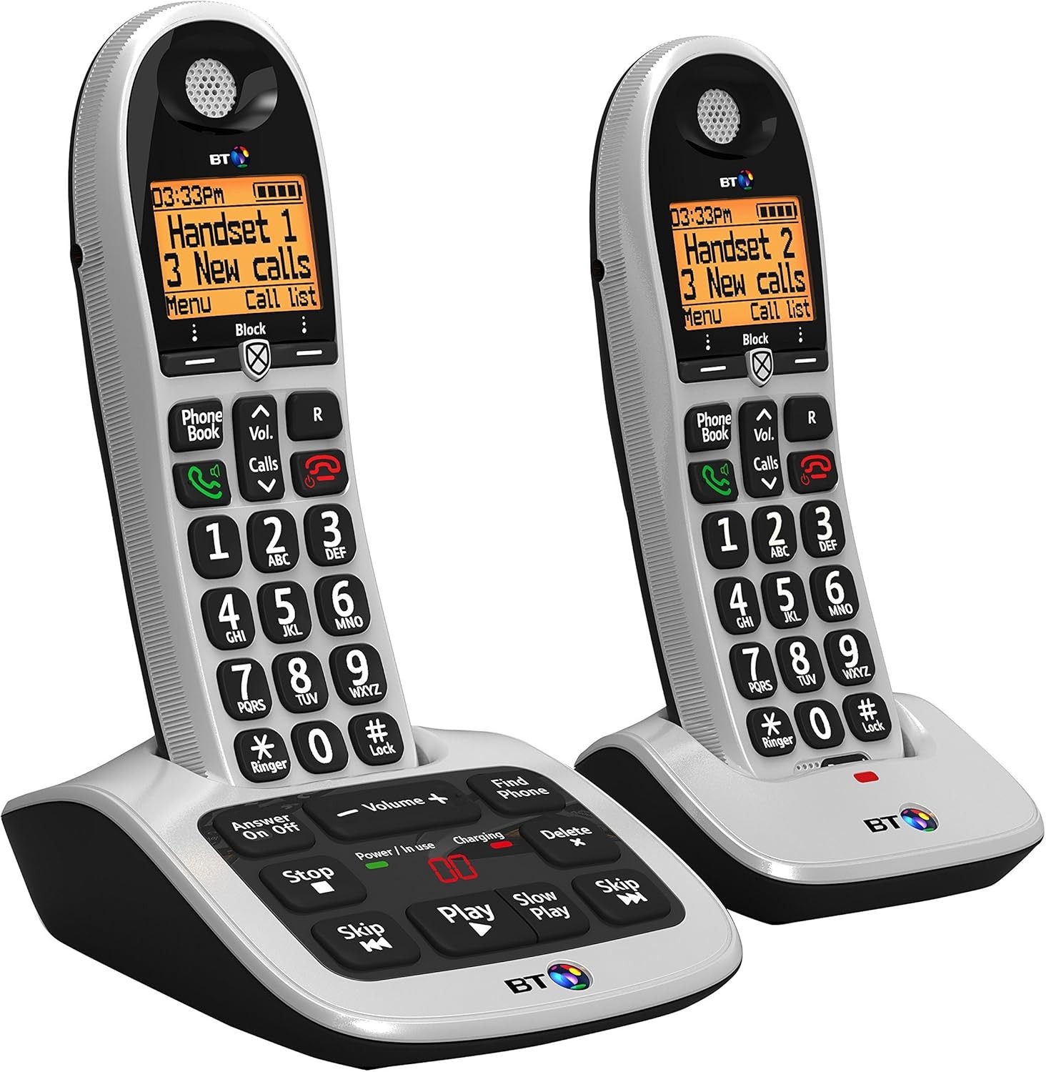 BT Big Button Advanced Call Blocker Cordless Phone with Answer Machine â Trio Handset Pack, One-Touch Block, trueCall, 60-min Msgs, 200-name