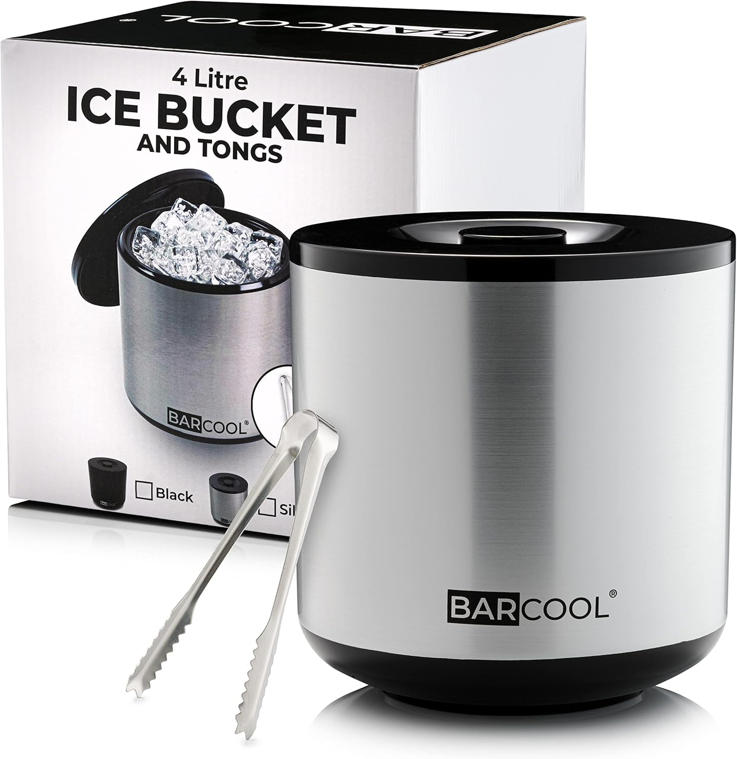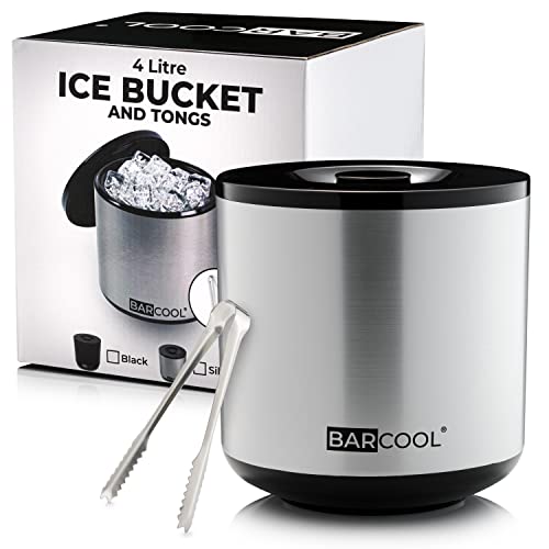 Barcool Ice Bucket with Lid and Ice Tongs | 4 Litre | Round & Double Walled Insulation | Perfect for Home Bars, Pubs, Restaurants, BBQs and Picnics (Silver)