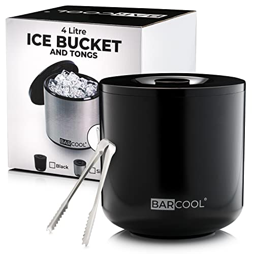 Barcool Ice Bucket with Lid and Ice Tongs | 4 Litre | Round & Double Walled Insulation | Perfect for Home Bars, Pubs, Restaurants, BBQs and Picnics (Black)