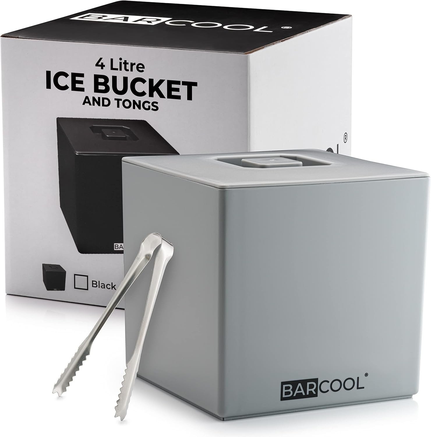 Barcool Ice Bucket with Lid and Ice Tongs | 4 Litre | Square & Double Walled Insulation | Perfect for Home Bars, Pubs, Restaurants, BBQs and Picnics (Grey)
