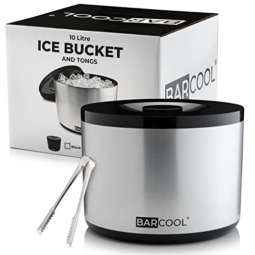 Barcool Ice Bucket with Lid and Ice Tongs | 10 Litre | Round & Double Walled Insulation | Perfect for Home Bars, Pubs, Restaurants, BBQs and Picnics (Silver)