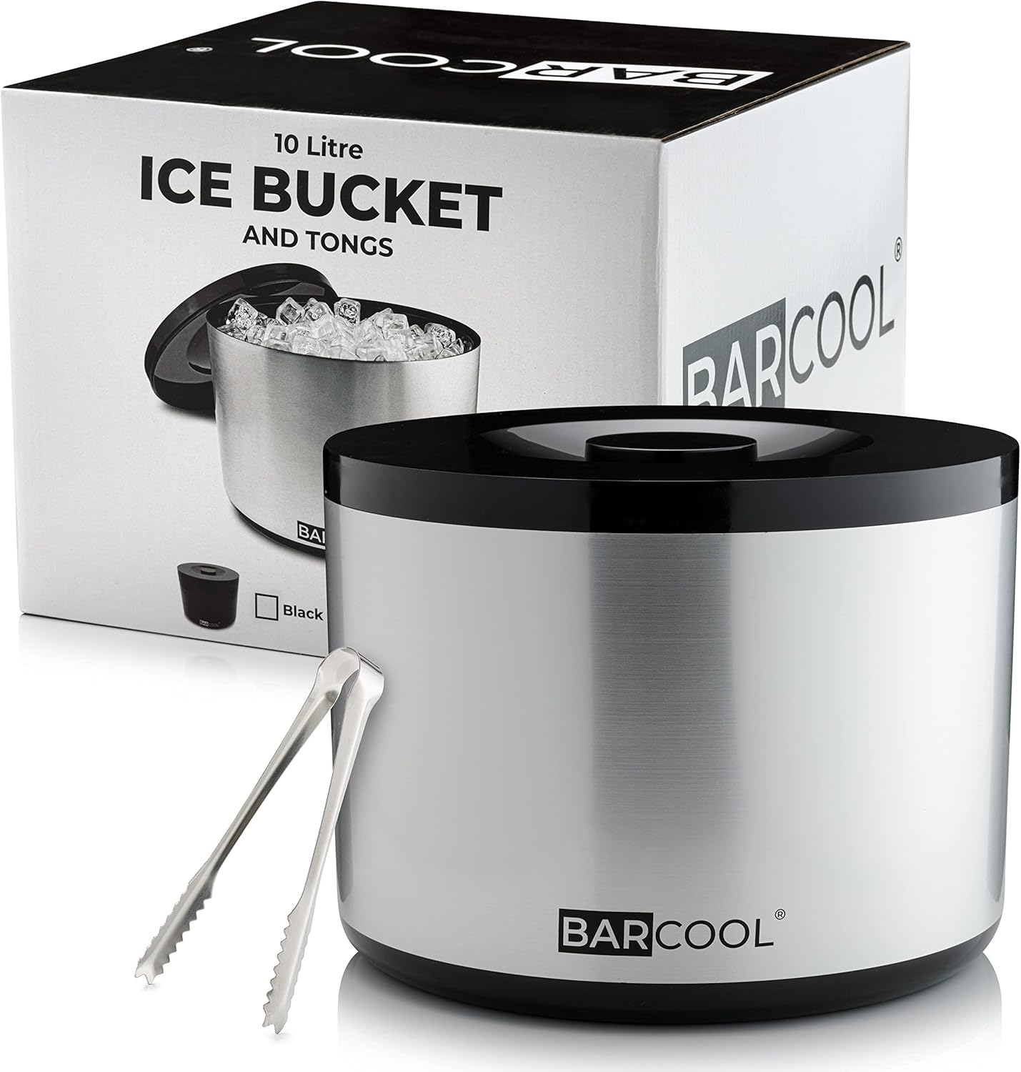 Barcool Ice Bucket with Lid and Ice Tongs | 10 Litre | Round & Double Walled Insulation | Perfect for Home Bars, Pubs, Restaurants, BBQs and Picnics (Black)