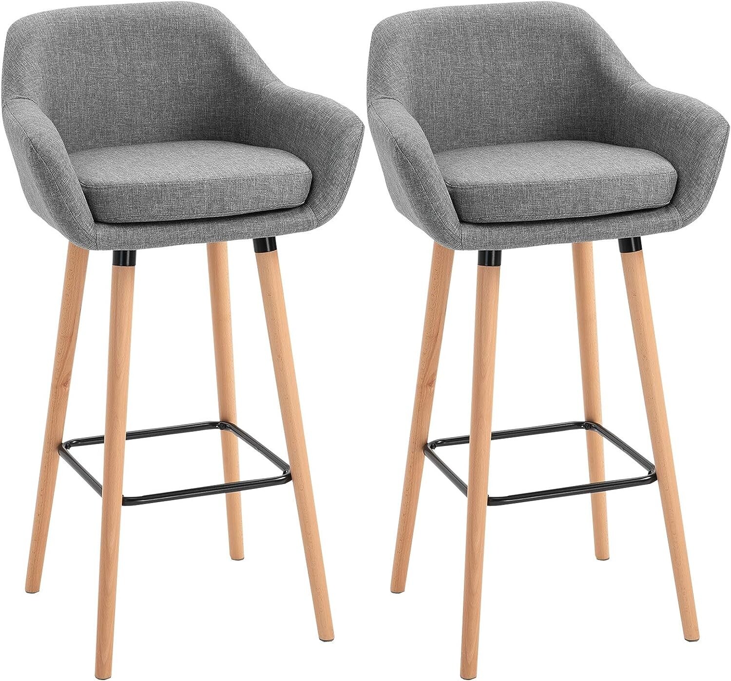 Grey Linen Bar Stools Bucket Seats Wood Legs Kitchen Cushioned Chairs 2 Pcs Set
