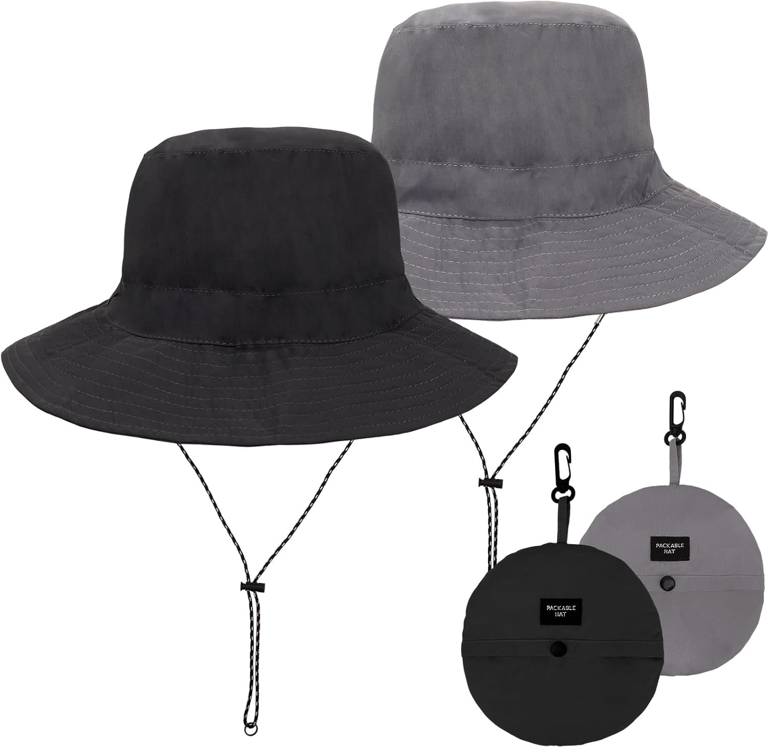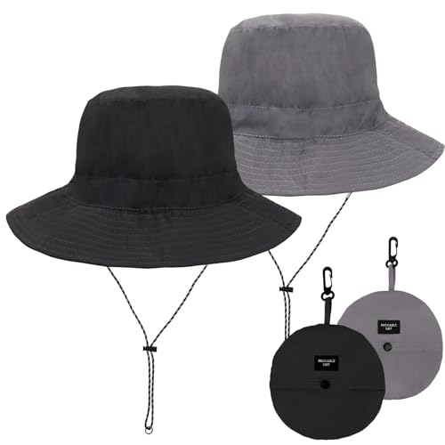 Sahunfri 2Pcs Bucket Hats, Packable Bucket Hat with String, Wide Brim, Ring Buckle, Sun Hat for UV Protection Women Men Beach Fishing Camping (UK, Alpha, One Size, Standard, Black+Grey)