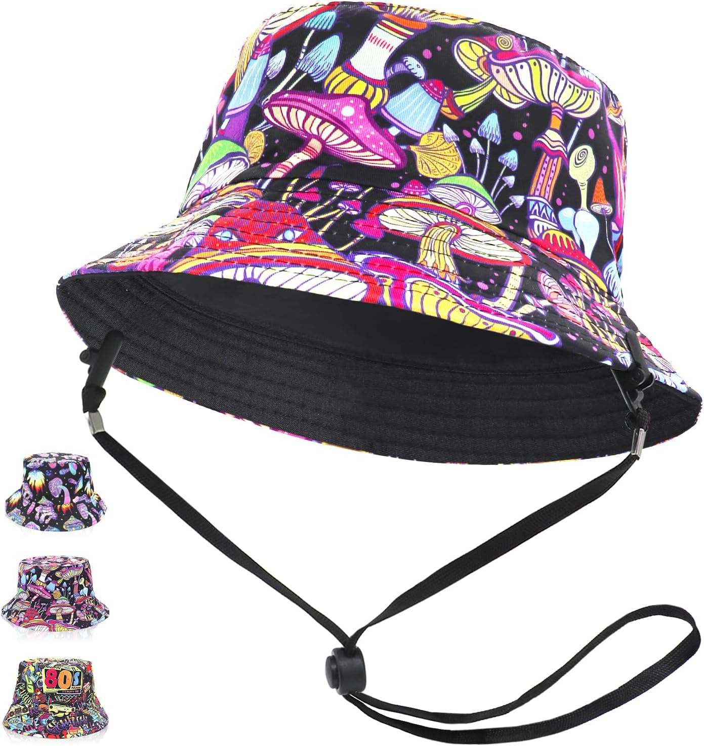 GLGHMH Unisex Reversible Bucket Hat with String, Double-Side Cotton Trendy Summer Fisherman Hat, Travel Sun Fisherman Bucket Hats for Women Men (Mushrooms-Fluorescent)