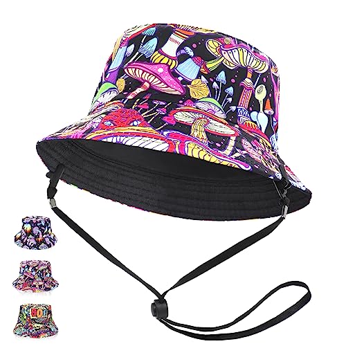 GLGHMH Unisex Reversible Bucket Hat with String, Double-Side Cotton Trendy Summer Fisherman Hat, Travel Sun Fisherman Bucket Hats for Women Men Boy Girl (Mushrooms-Colored)