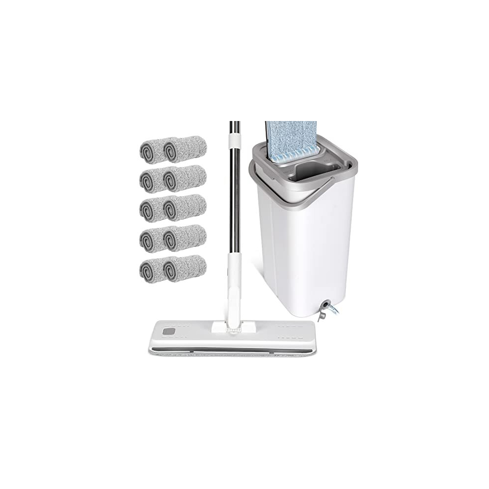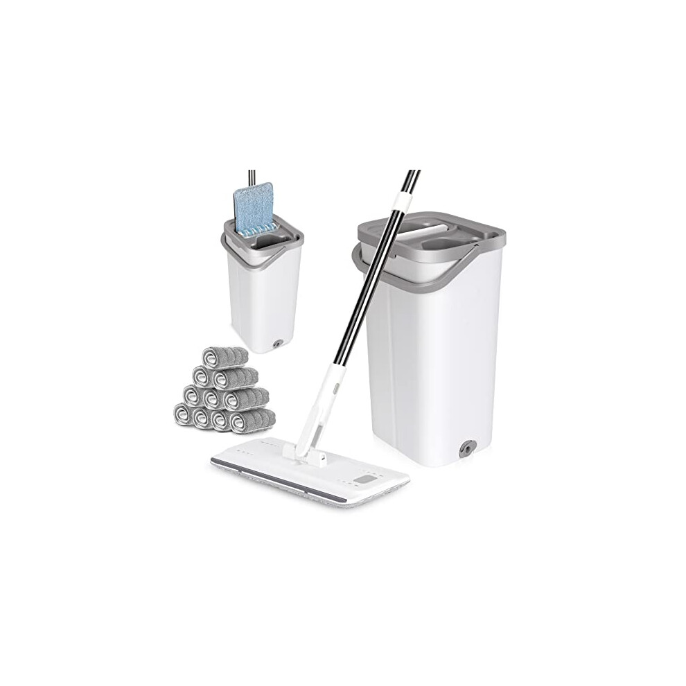 Floor Mop and Buckets Sets, Flat Mop Bucket Set with 10pc Reusable Pads & 140cm Long Handle, Microfibre Mops for Cleaning Laminate Tile Hardwood