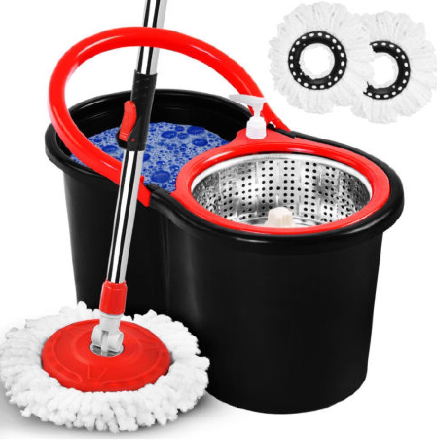 (RED) 360° MOP BUCKET SET FLOOR MAGIC SPIN DRY MOP BUCKET SET WITH 2 MICROFIBER HEADS