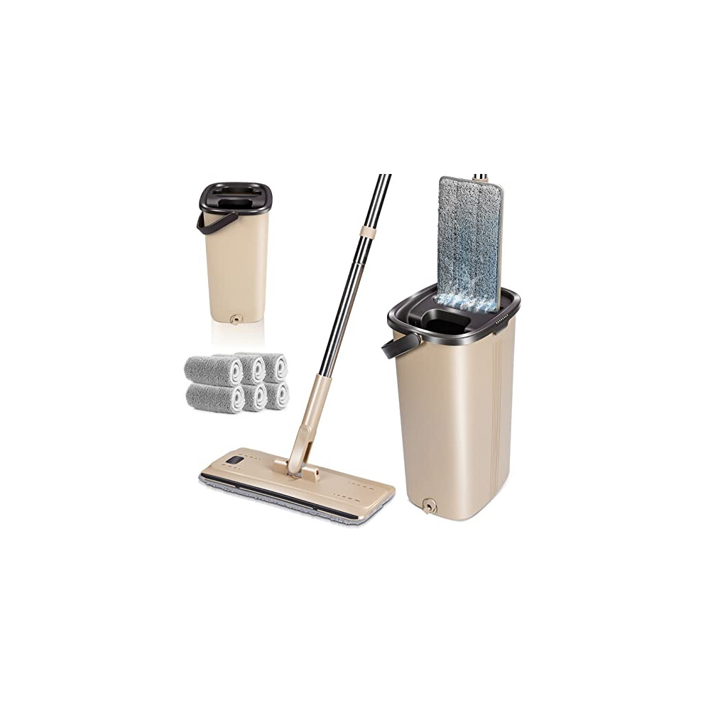 MASTERTOP Mop and Bucket,2 in 1 Self-Cleaning Floor Mop with Wring System,Hands Free Flat Mop Bucket Set with Adjustable Stainless Steel Handle&6 Microfibre Pads for Hardwood Laminate Tile Floors