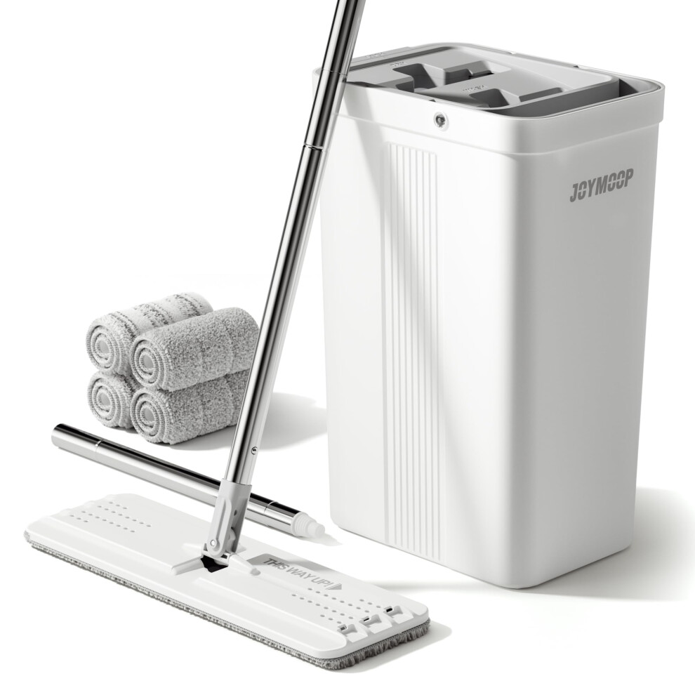 JOYMOOP Mop and Bucket with Wringer Set for Home, Hands Free White Flat Squeeze Mop Bucket Set for Floor Cleaning and Wall Cleaner with Long Handle,