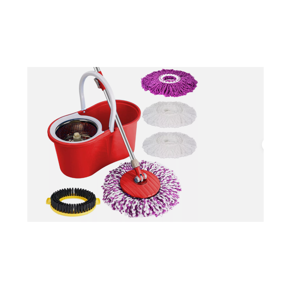RED MOP BUCKET SET 360 FLOOR MAGIC SPIN MICROFIBER WITH 4 MOP HEADS + BRUSH NEW