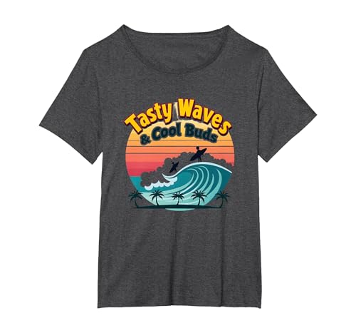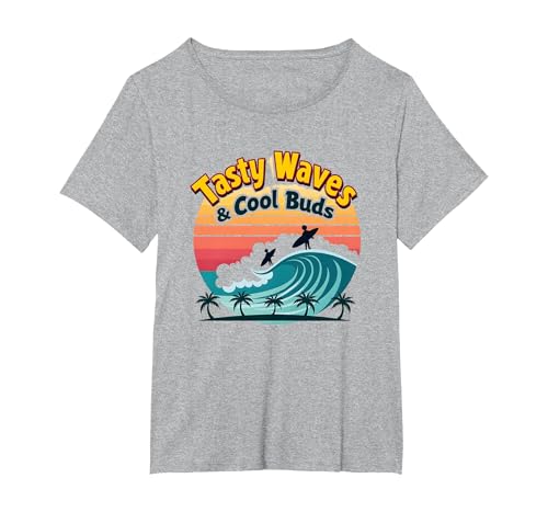 Tasty Waves & Cool Buds: Retro Surf Beach Vibes T-Shirt, Women's Plus, Heather Grey, 1X
